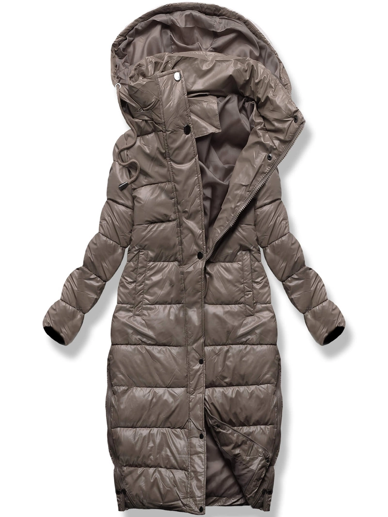 Brązowy zimowy długi płaszcz kurtka zimowa z dużym kapturem netmoda