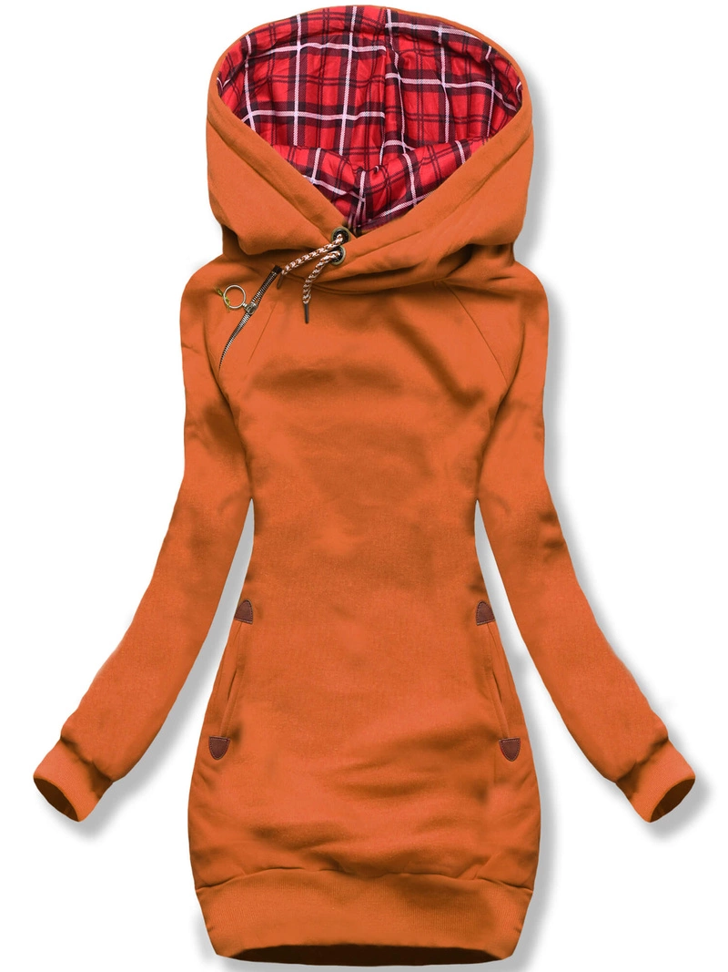 Karmelowa czaderska damska bluza typu long z kapturem