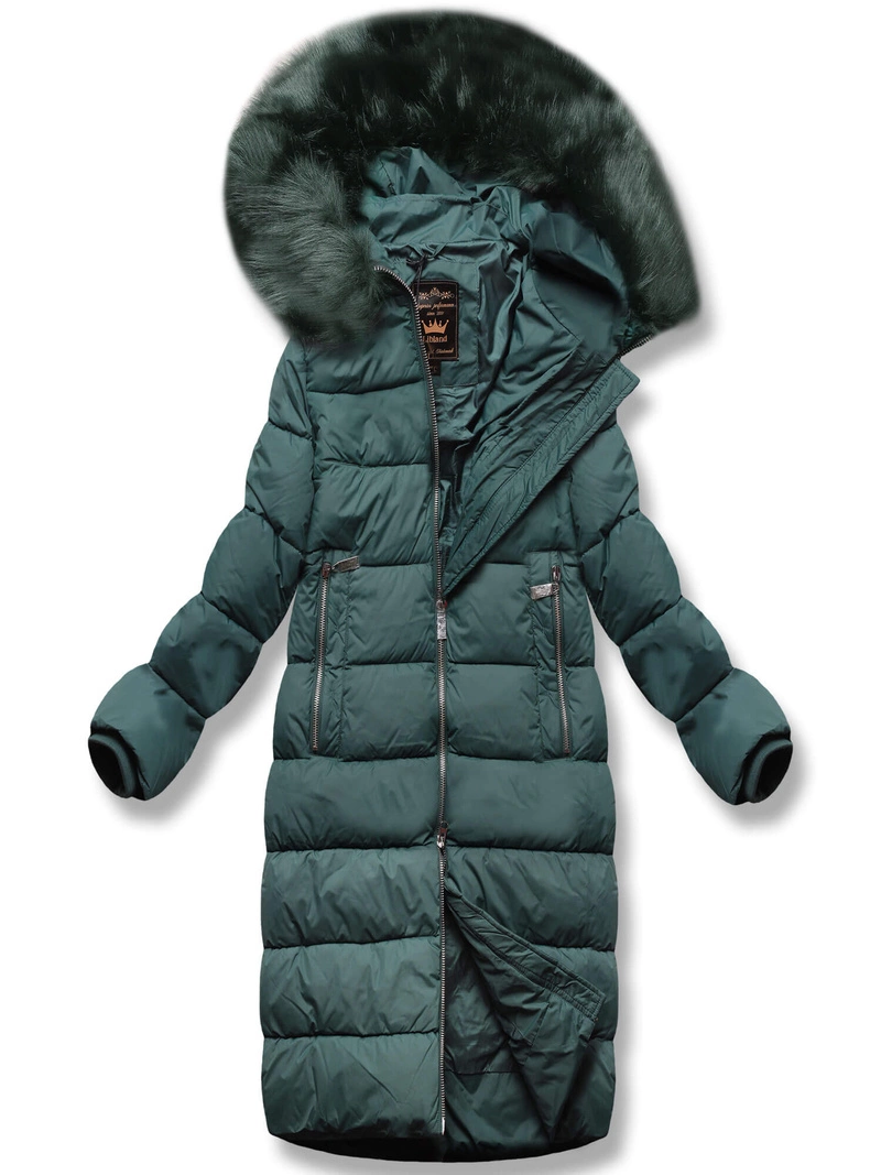Ciemnozielona długa ciepła rewelacyjna zimowa kurtka damska płaszczyk z kapturem