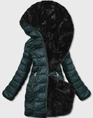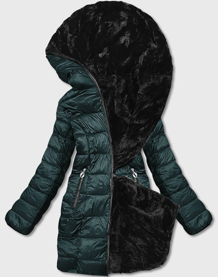 Zielona długa fantastyczna dwustronna zimowa pikowana kurtka futerko