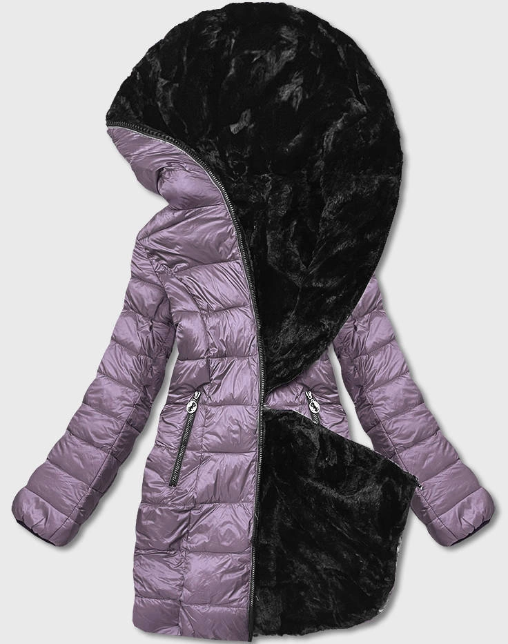Fioletowa długa fantastyczna dwustronna zimowa pikowana kurtka futerko