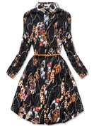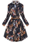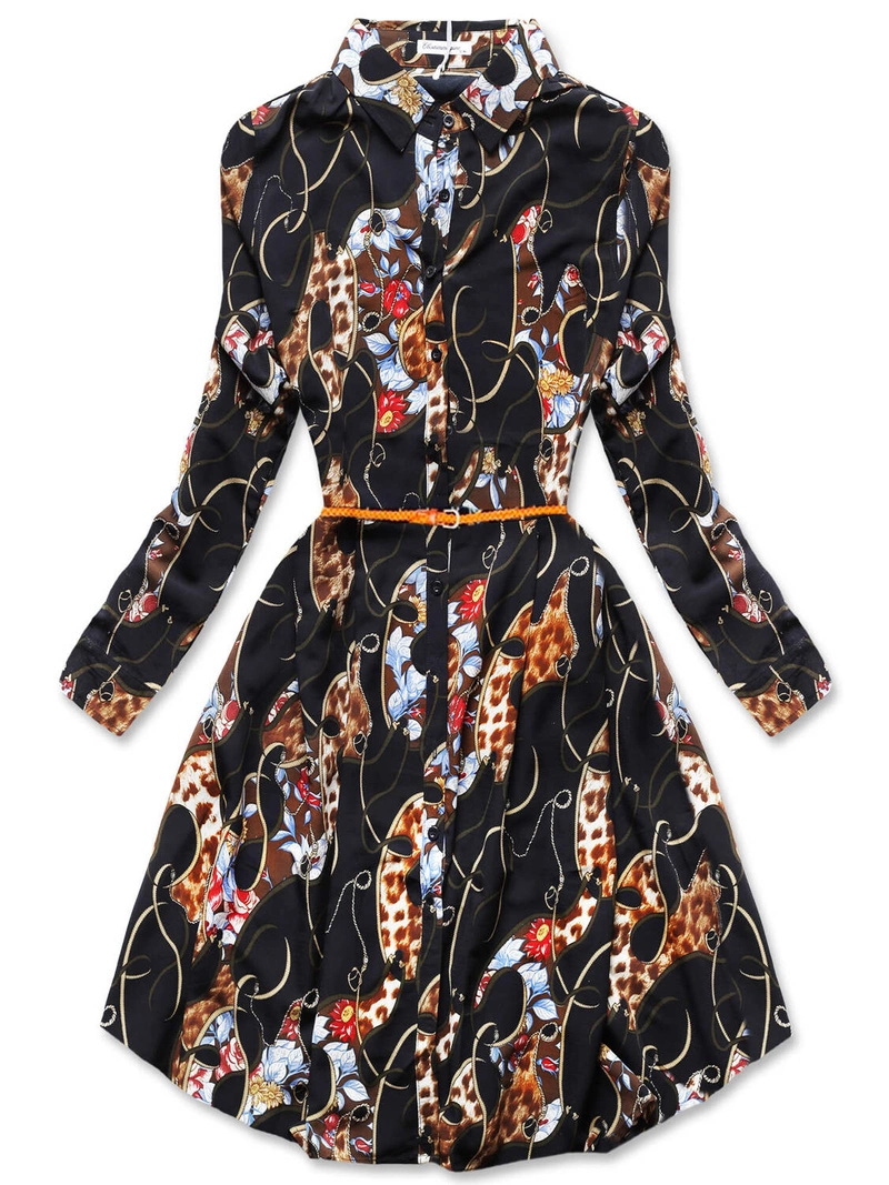 Czarna wzorzysta sukienka z kołnierzykiem i paskiem z plisowanym dołem