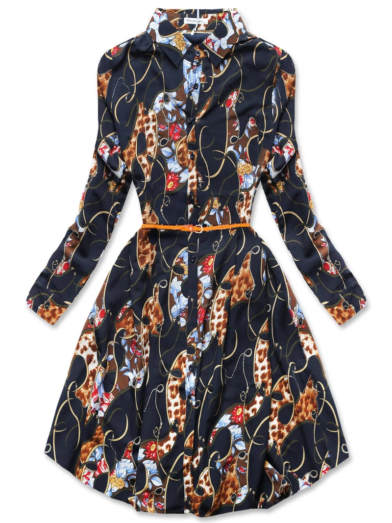 Granatowa wzorzysta sukienka z kołnierzykiem i paskiem z plisowanym dołem