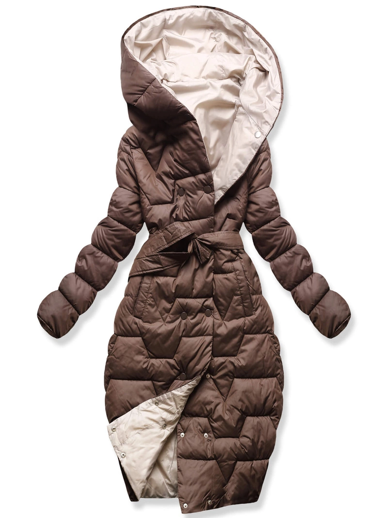 Czekoladowo beżowy dwustronny zimowy damski płaszcz z kapturem i paskiem