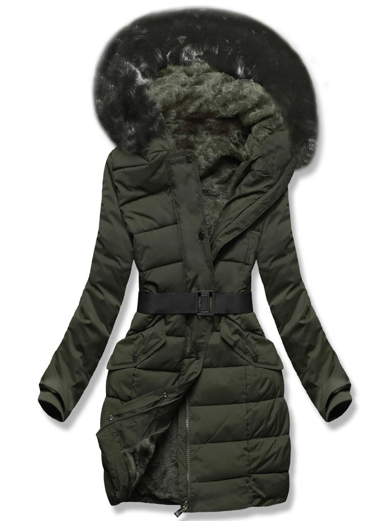 Ciemnozielona puchowa pikowana kurtka z kapturem i paskiem