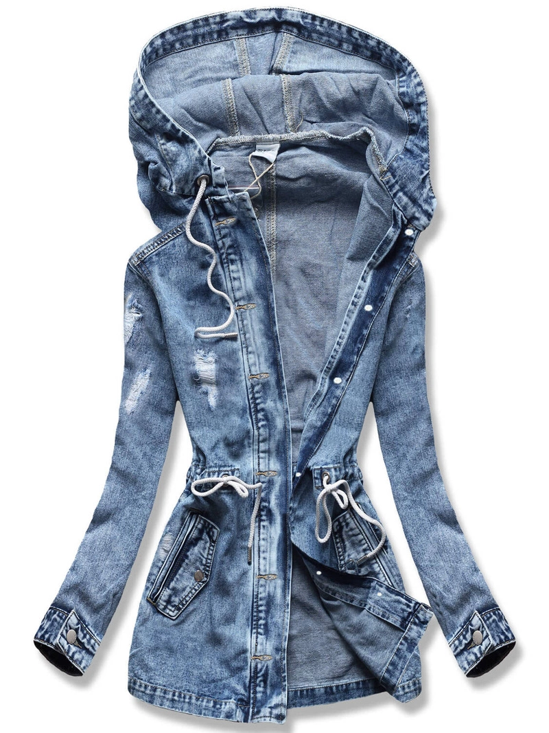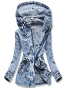 Jasnoniebieska jeansowa kurtka przejściowa narzutka płaszcz na guziki z kapturem i troczkami
