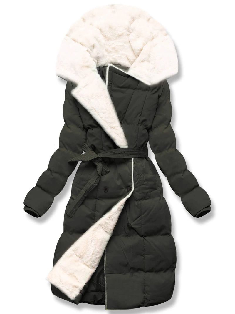 Khaki pikowana zimowa kurtka płaszcz z kołnierzem na kożuchu
