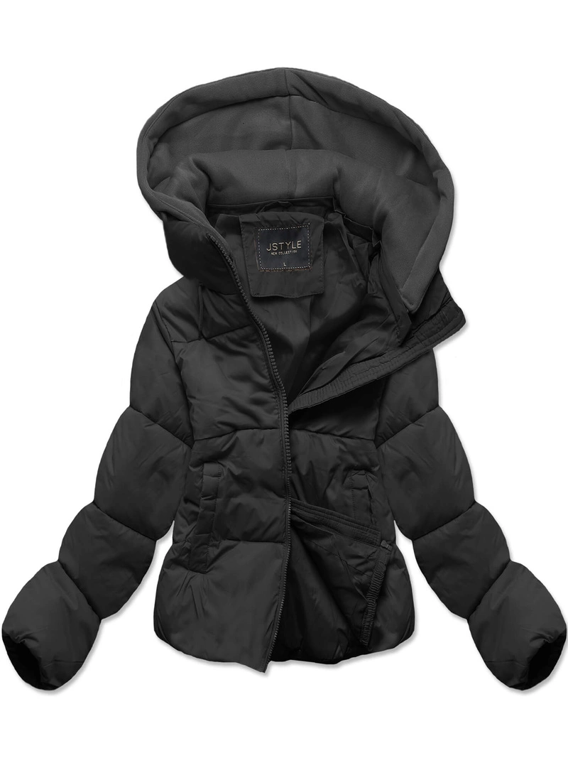 Czarna krótka pikowana zimowa kurtka z dresowym kapturem