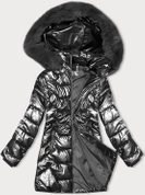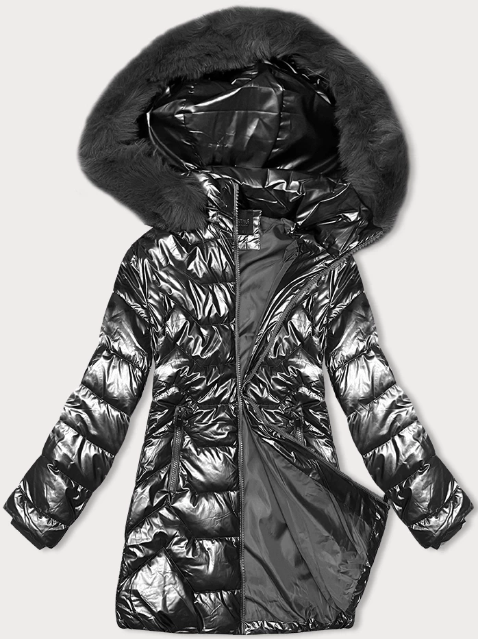 Grafitowa połyskująca taliowana kurtka z kapturem