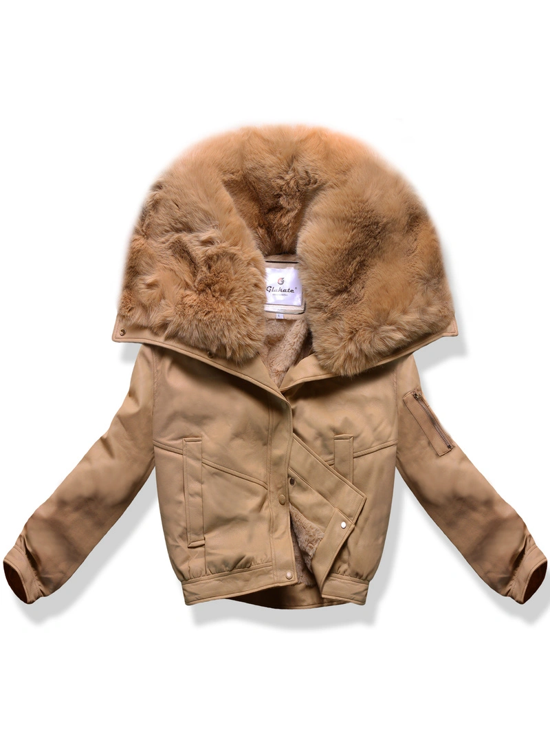 Beżowa skórzana damska krótka kurtka futerko