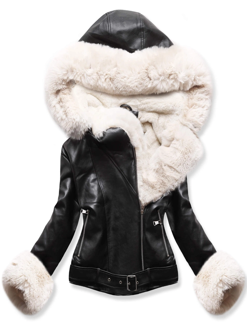 Czarna genialna zimowa kurtka damska skórzana ramoneska na futrze