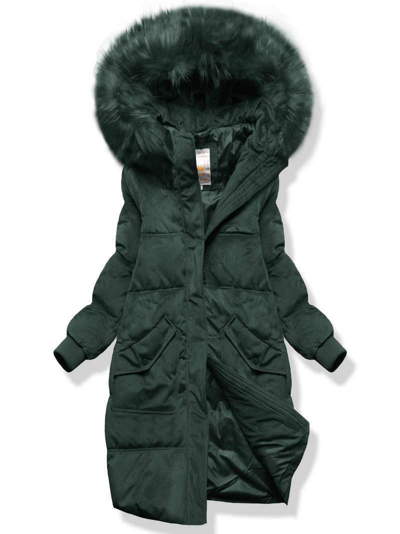 Zielona sztruksowa długa zimowa kurtka z kapturem