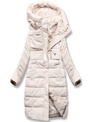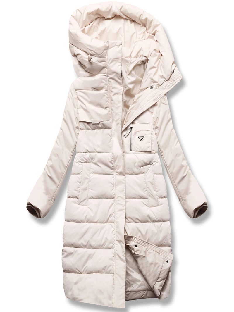 Jasnobeżowa długa zimowa kurtka damska pikowana z kapturem