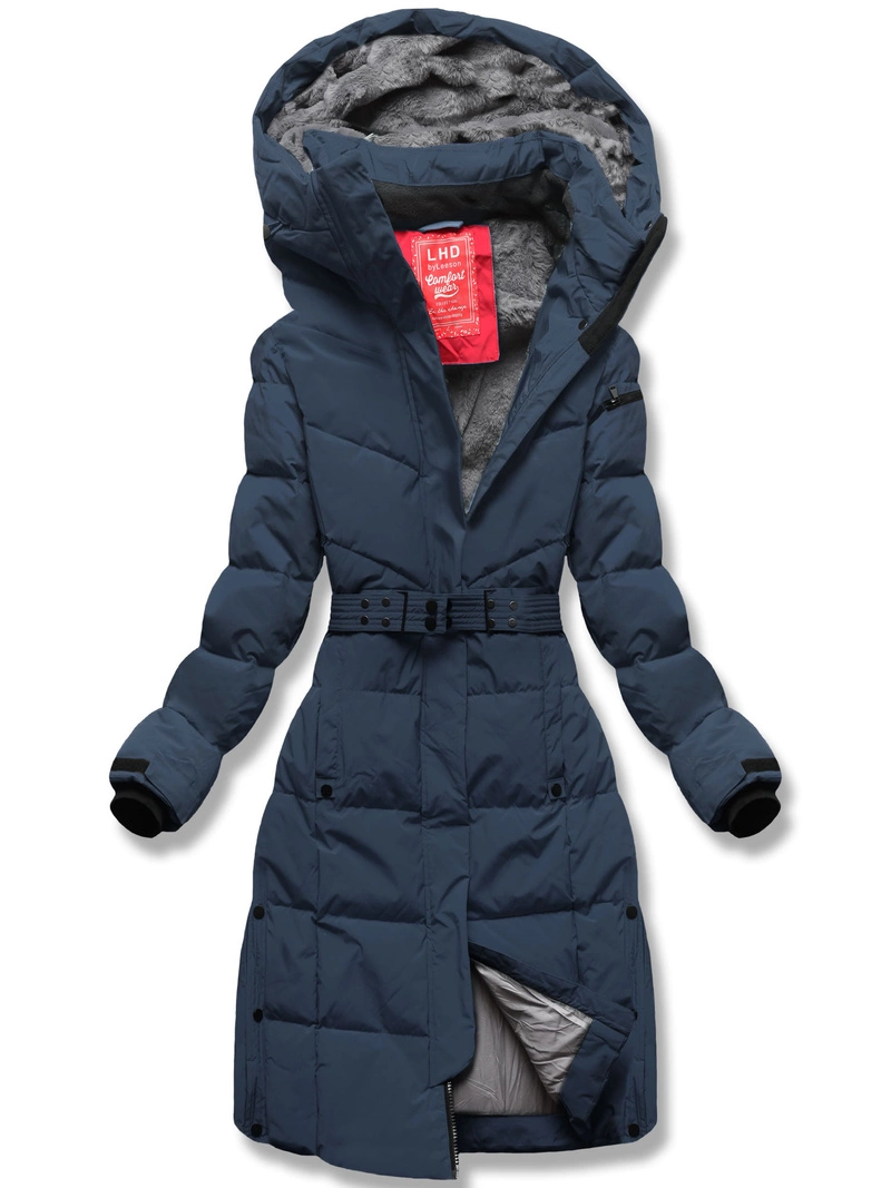 Granatowa pikowana damska kurtka zimowa z paskiem