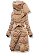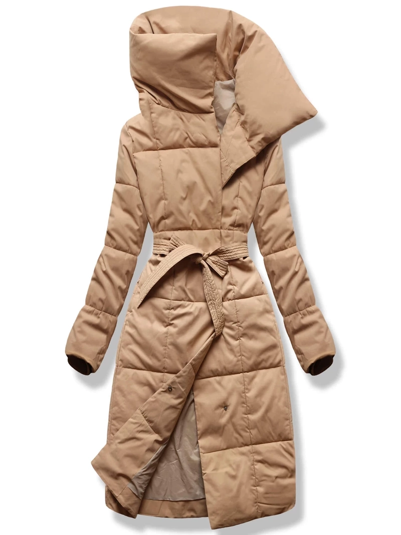 Beżowy długi zimowy płaszczyk z kapturem i paskiem