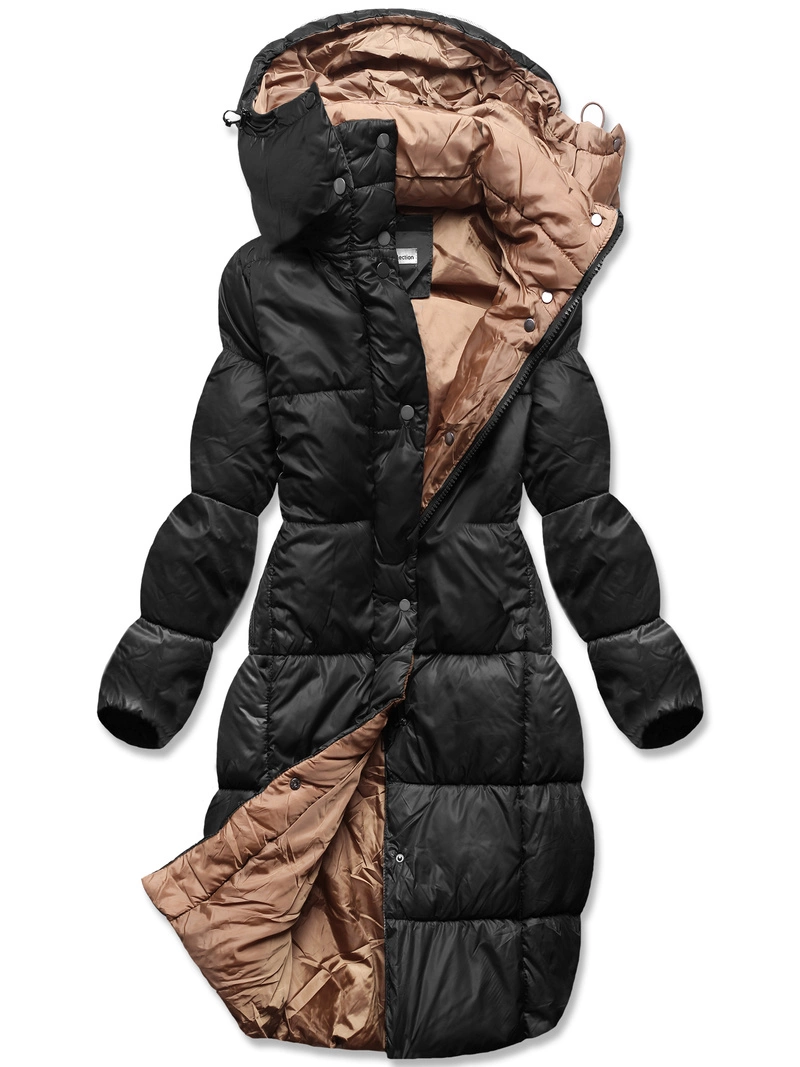 Czarna zimowa pikowana długa ciepła kurtka z kapturem kołnierzem