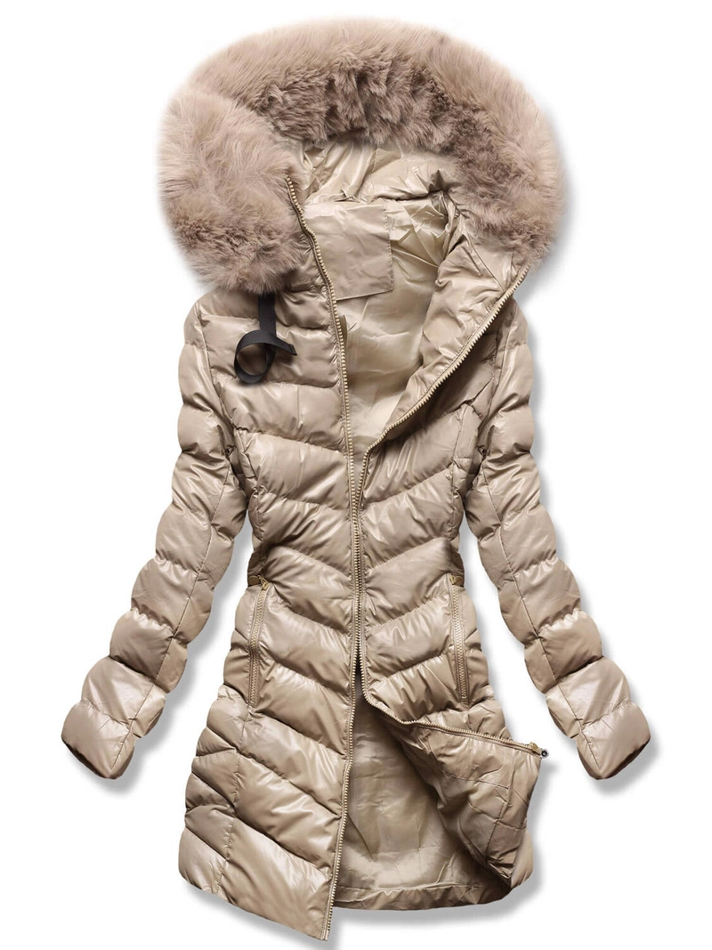 Beżowa długa zimowa kurtka płaszczyk z kołnierzem