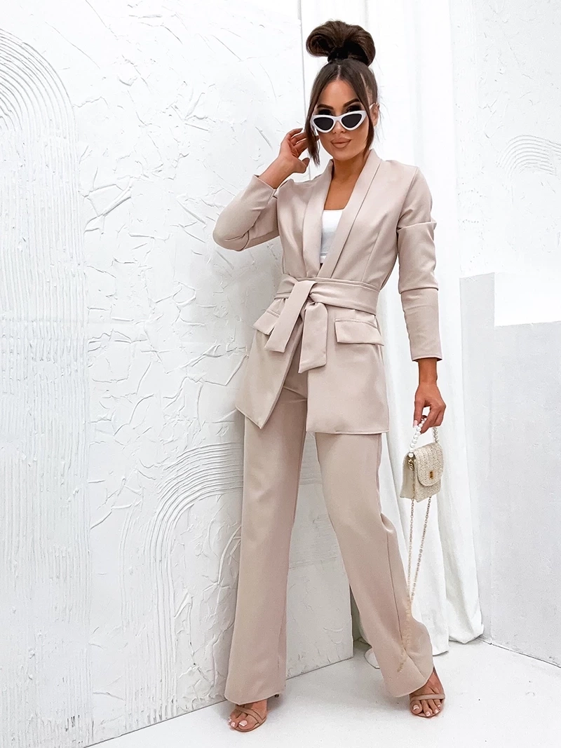 Pudrowy elegancki komplet oversizowa marynarka i luźne spodnie
