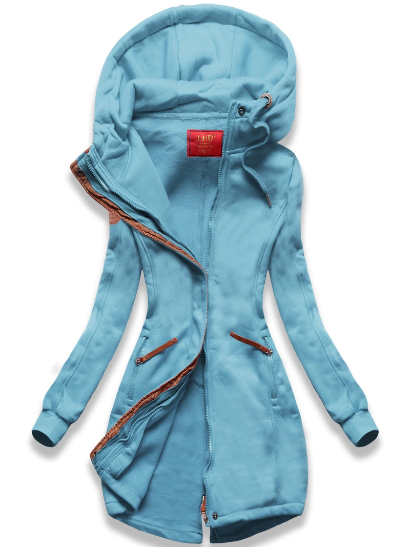 Błękitna długa bluza z łączonych materiałów na suwak i z dużym kapturem