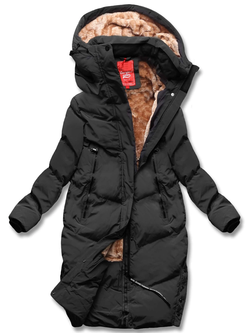 Czarny długi płaszczyk kurtka zimowa - na ciepłym misiu z kapturem