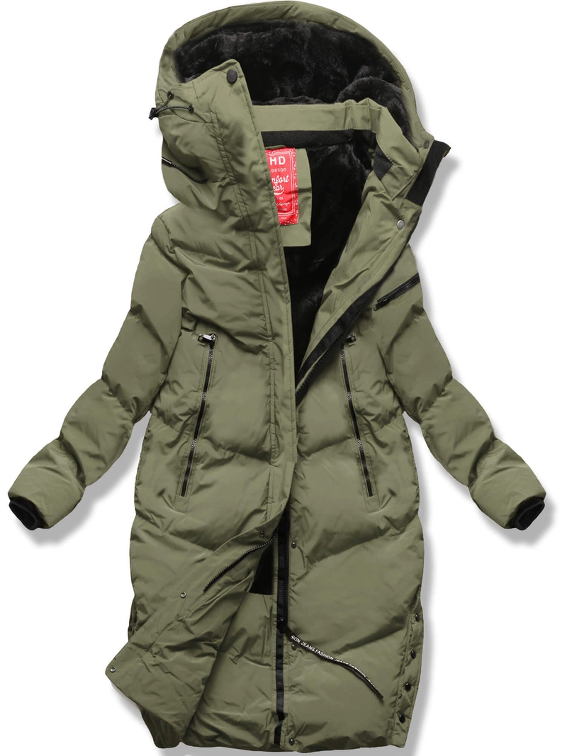 Oliwkowy długi płaszczyk kurtka zimowa - na ciepłym misiu z kapturem