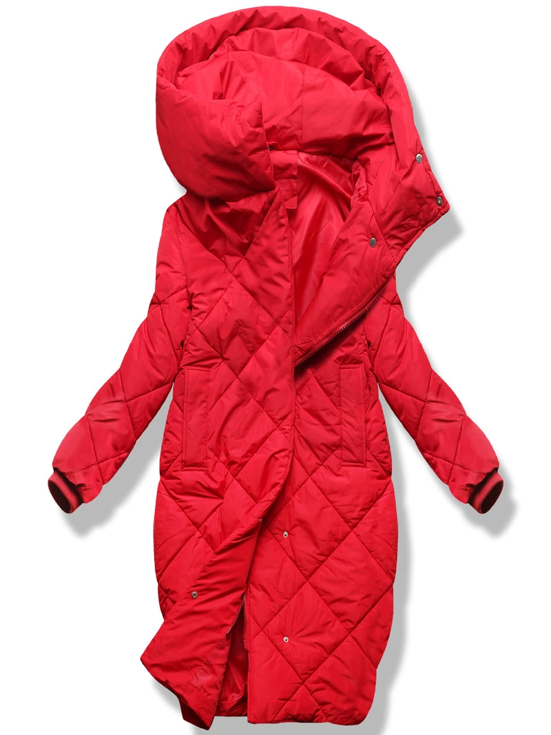 Czerwona pikowana w karo damska kurtka płaszczyk zimowy z kapturem