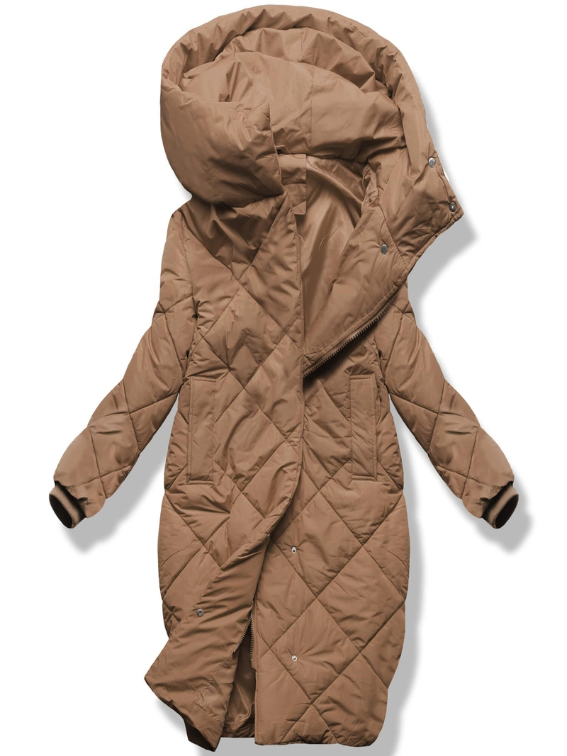 Ciemnobeżowa pikowana w karo damska kurtka płaszczyk zimowy z kapturem