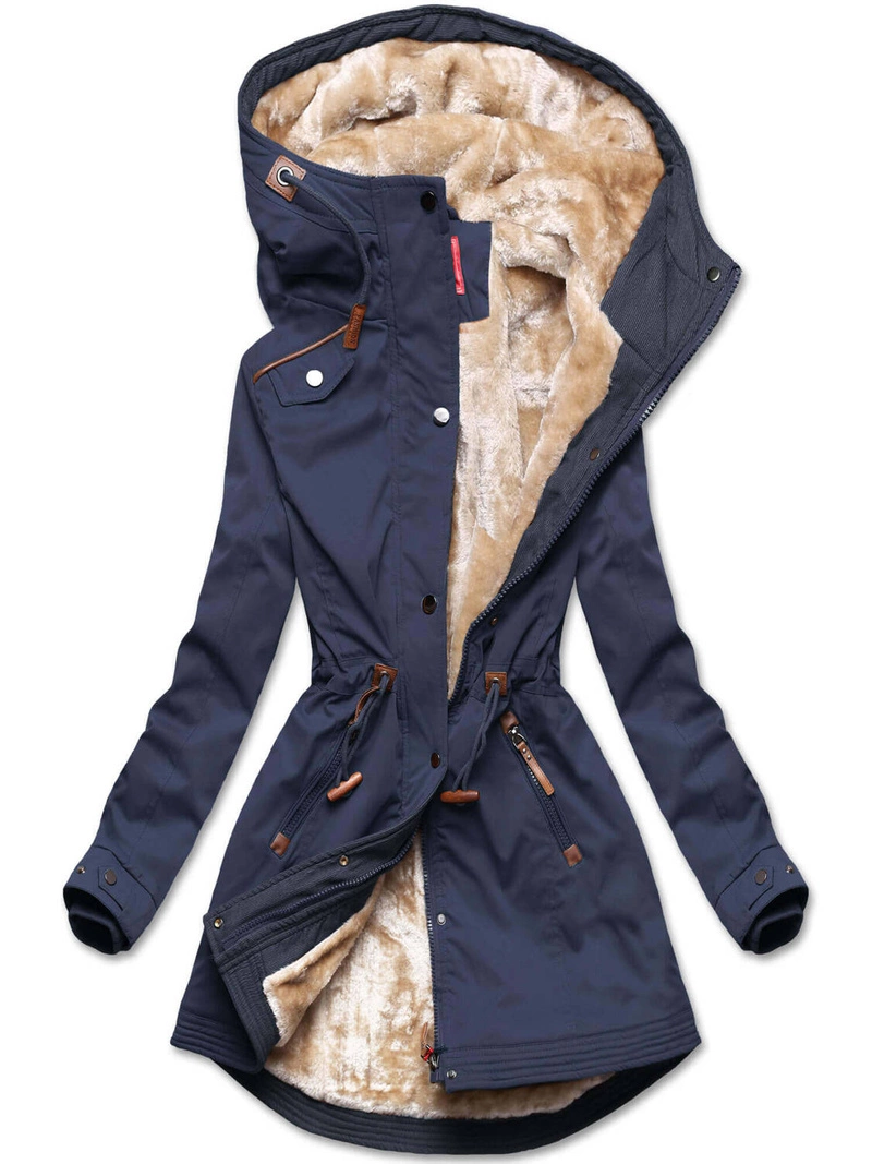 Granatowy długi płaszczyk kurtka zimowa - na ciepłym misiu z kołnierzem