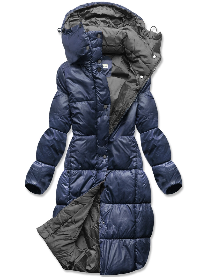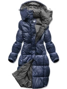 Granatowa zimowa pikowana długa ciepła kurtka z kapturem kołnierzem