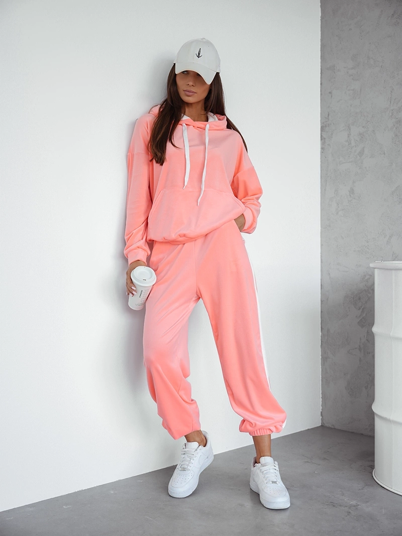 Brzoskwiniowy welurowy gładki dres damski z kapturem