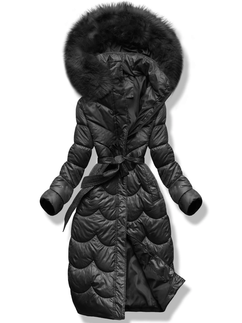Czarna pikowana zimowa kurtka z kapturem i paskiem