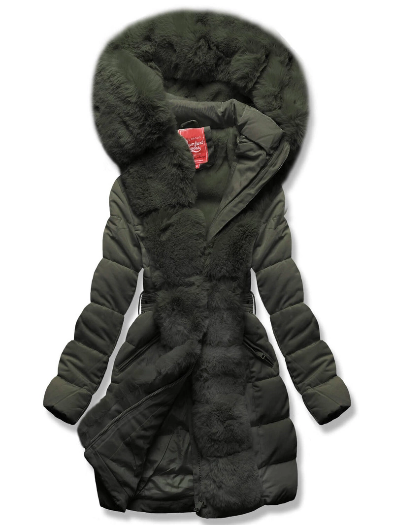 Khaki zimowa śliczna kurtka z paskiem w tali