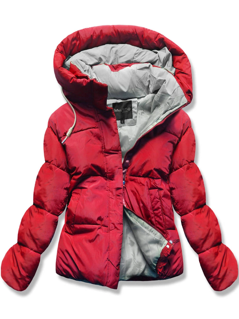 Czerwona zimowa pikowana kurtka z kapturem i kołnierzem