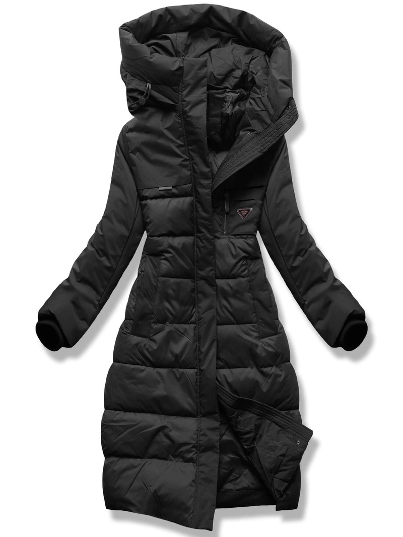 Czarny długi zimowy pikowany płaszczyk kurtka z kapturem