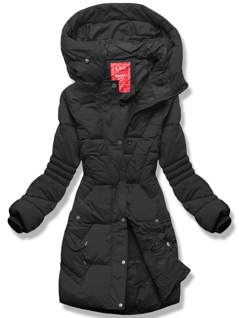 Czarna długa wyszczuplająca pikowana kurtka w jodełkę z kapturem