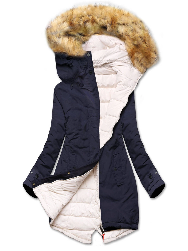 Granatowa Beżowa długa dwustronna ciepła kurtka parka z kapturem z odpinanym futerkiem