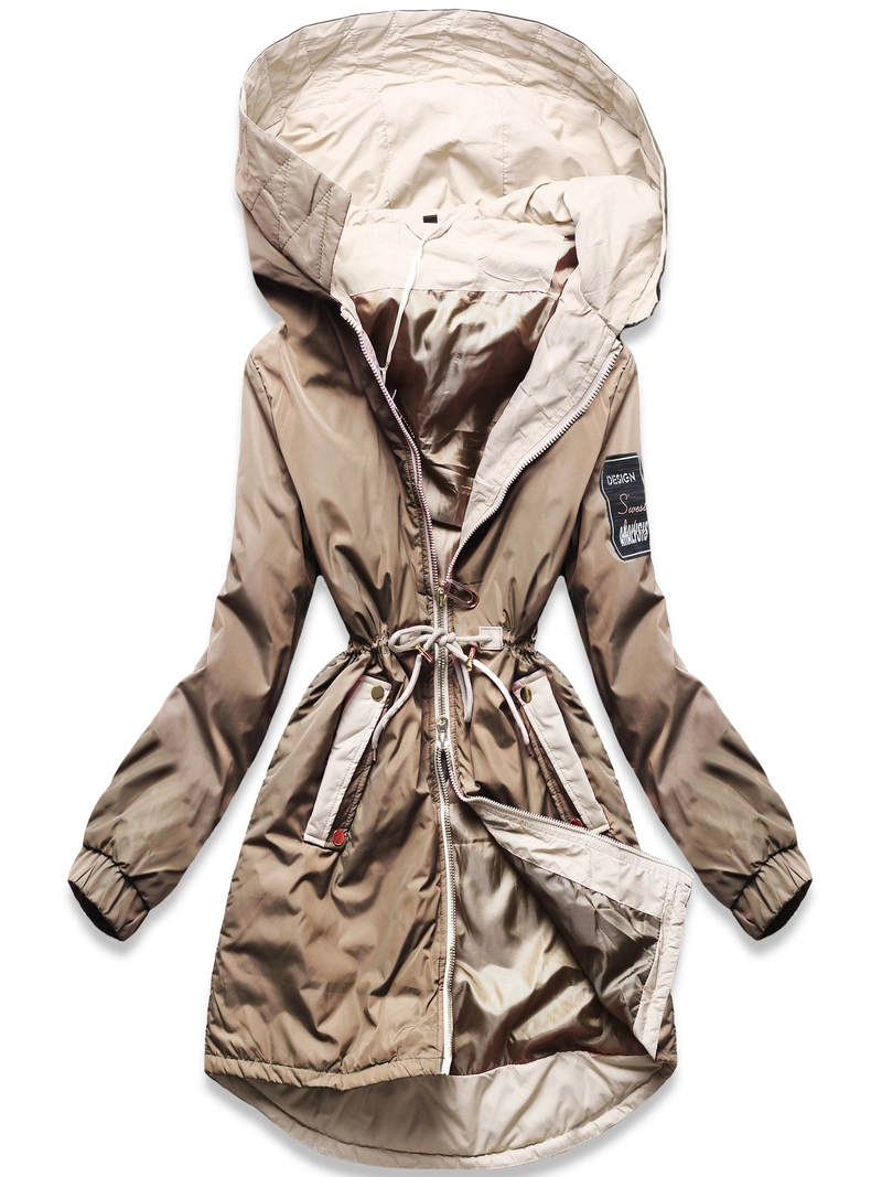 Ciemnobeżowa damska przejściowa kurtka parka z kapturem