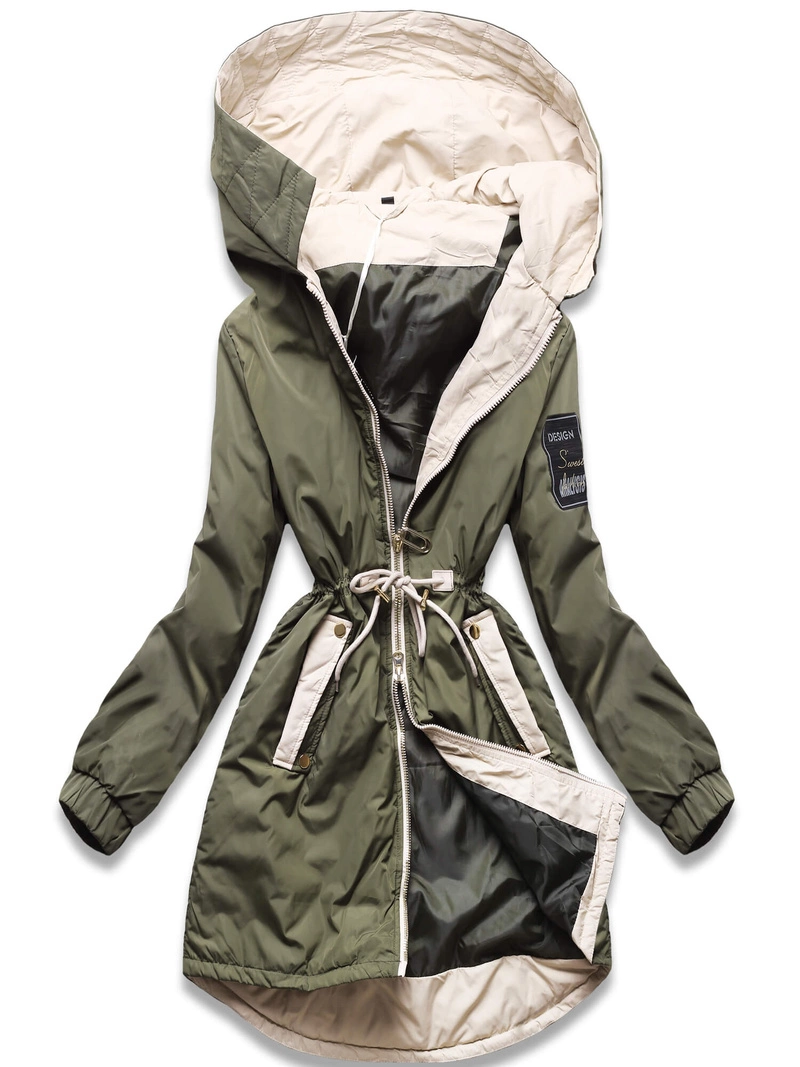 Oliwkowa czaderska damska przejściowa kurtka parka z kapturem