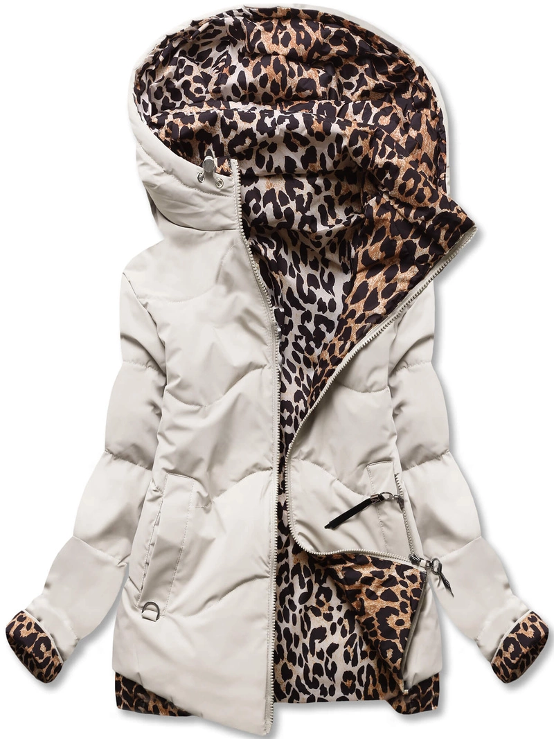Beżowa damska przejściowa kurtka panterka z kapturem