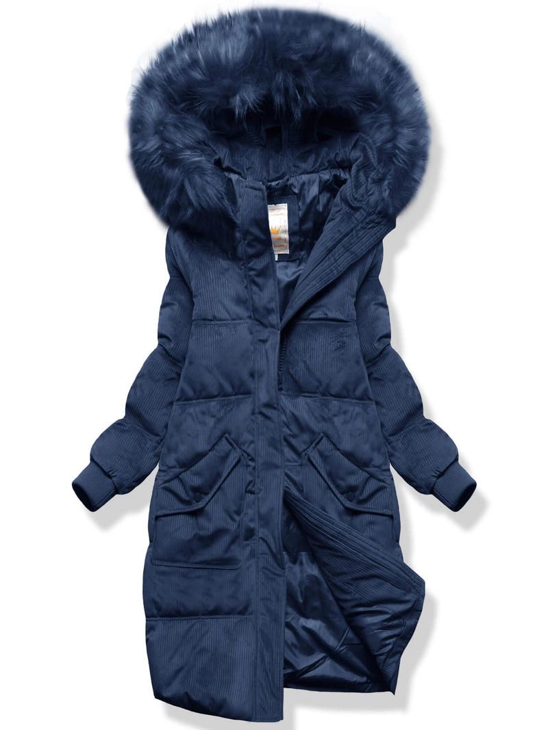 Granatowa sztruksowa długa zimowa kurtka z kapturem
