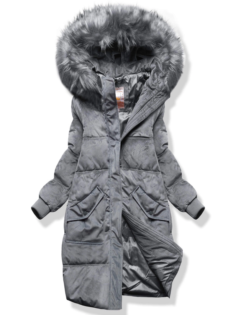 Szara sztruksowa długa zimowa kurtka z kapturem