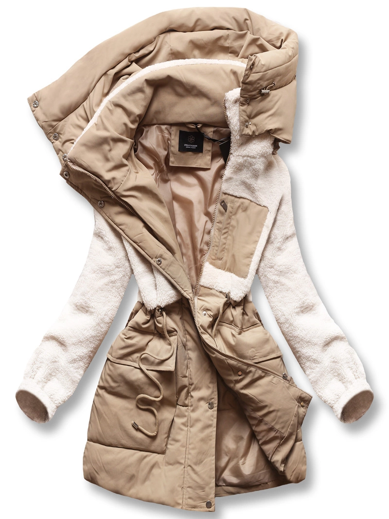 Beżowy płaszcz kurtka zimowa z łączonych materiałów