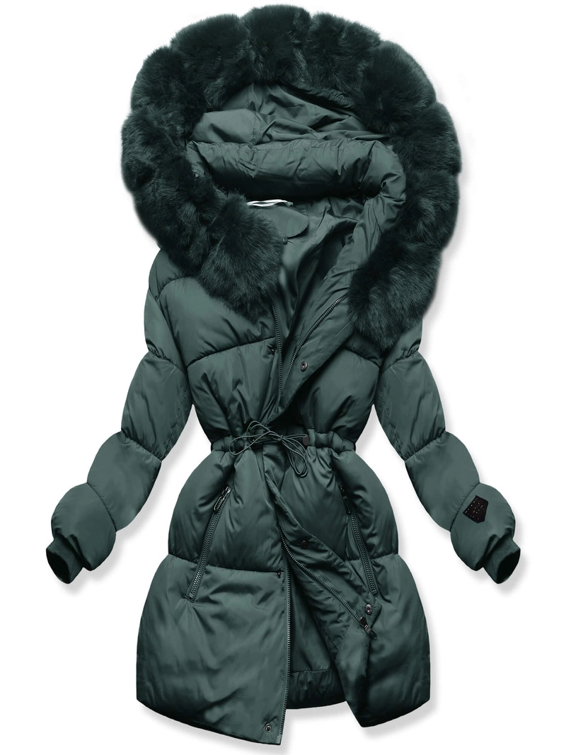 Ciemnozielona genialna długa zimowa damska kurtka z kapitalnym kapturem