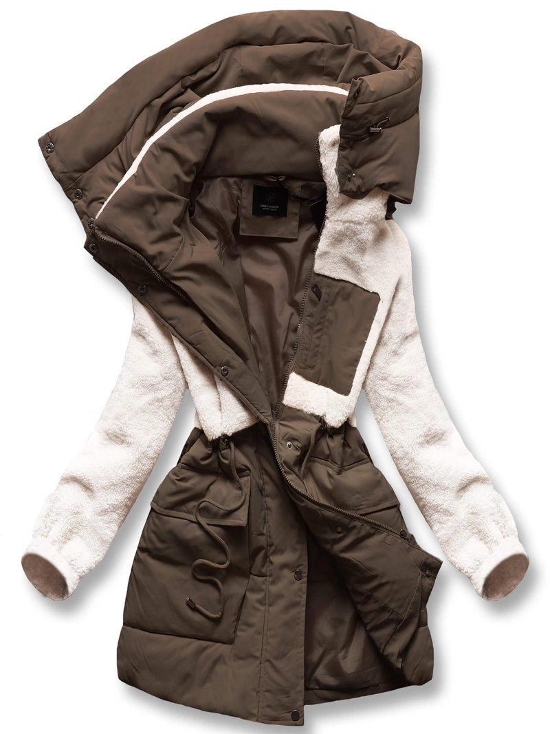 Kakaowa zimowa pikowana kurtka z kapturem i kołnierzem