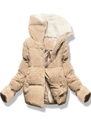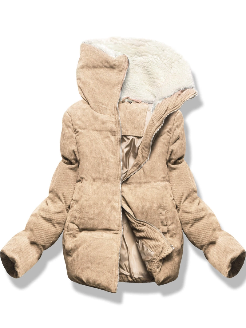 Piaskowa sztruksowa krótka pikowana zimowa kurtka z kołnierzem na futerku zapinana na suwak