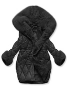 Czarna ciepła zimowa pikowana kurtka z futrzanym kapturem