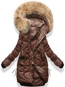 Brązowa damska puchowa zimowa damska kurtka z unikalnym kapturem