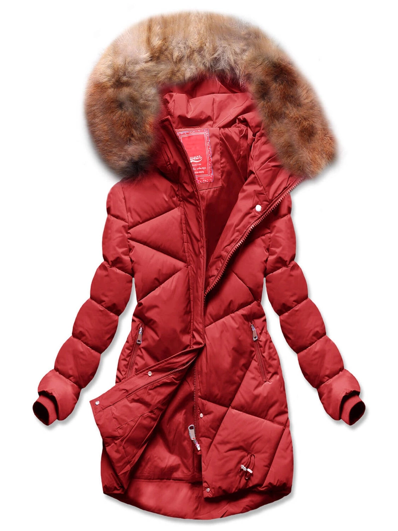 Ceglana pikowana ocieplana misiem zimowa kurtka płaszczyk z kapturem