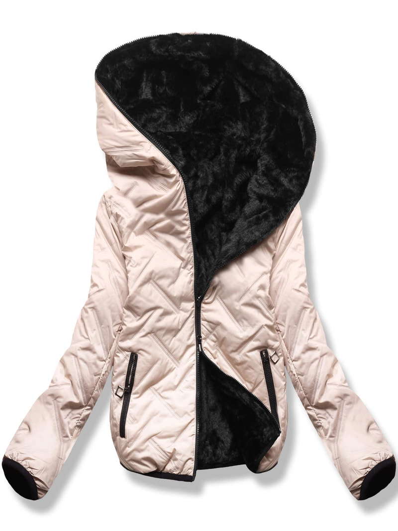 Beżowo brązowa dwustronna zimowa damska kurtka z kapturem