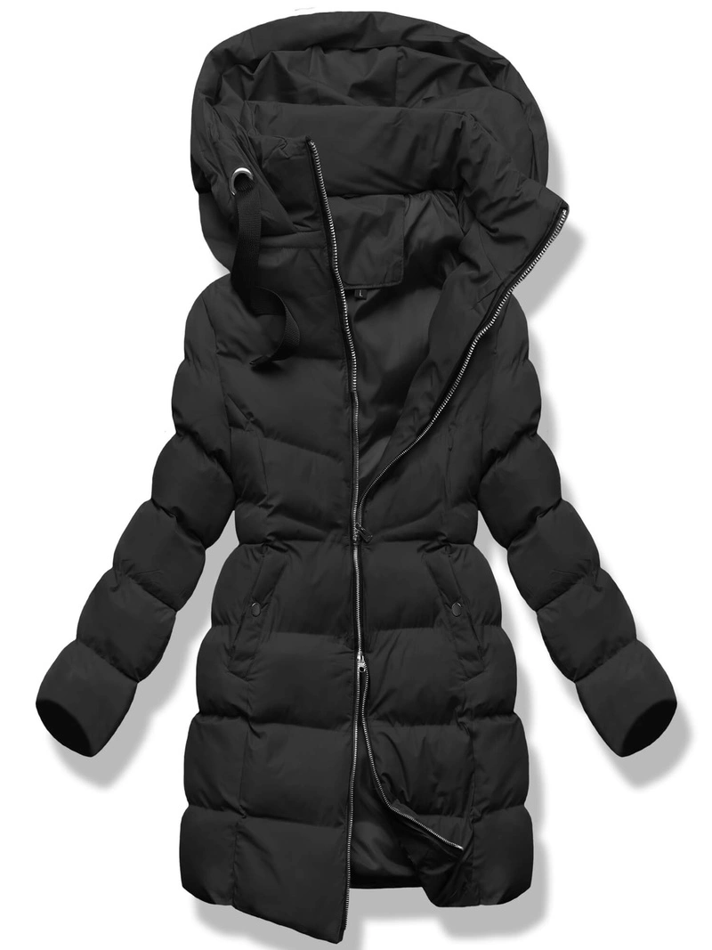 Czarna zimowa kurtka z kapturem i kołnierzem płaszcz pikowany na suwak